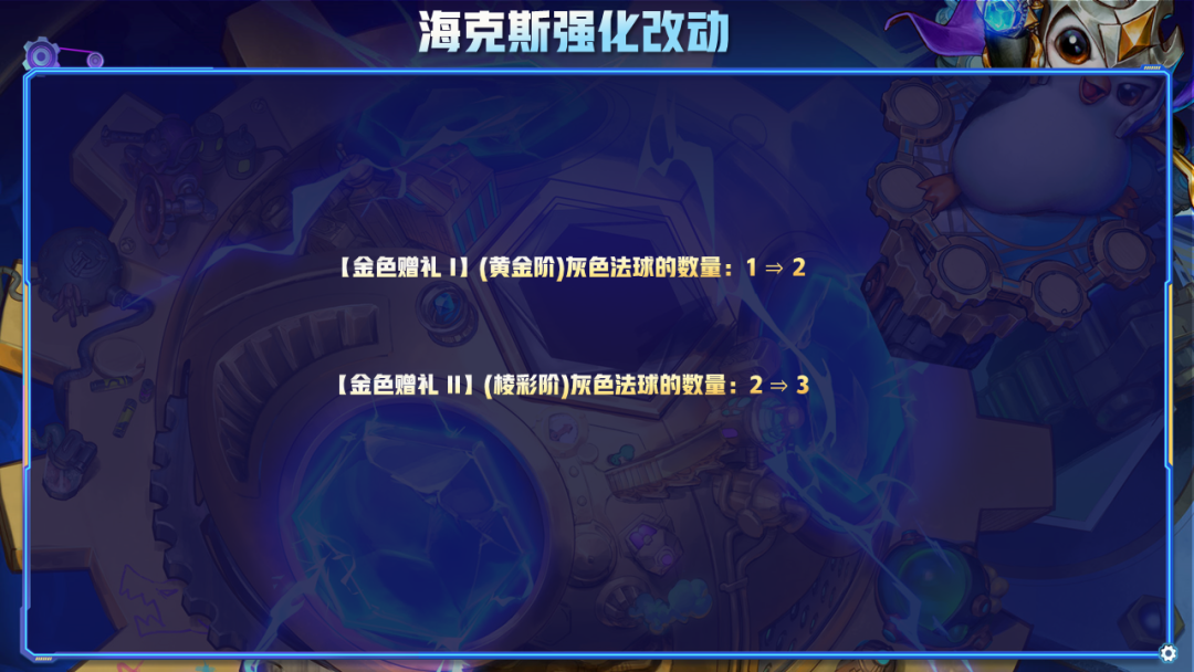 解析:小加强,但是没什么用!但是如果1-4出现金色赠礼II的话还是可以拿的,后面两次海克斯强化出现的话就没必要拿了!当然你可以赌它出妮蔻哈!