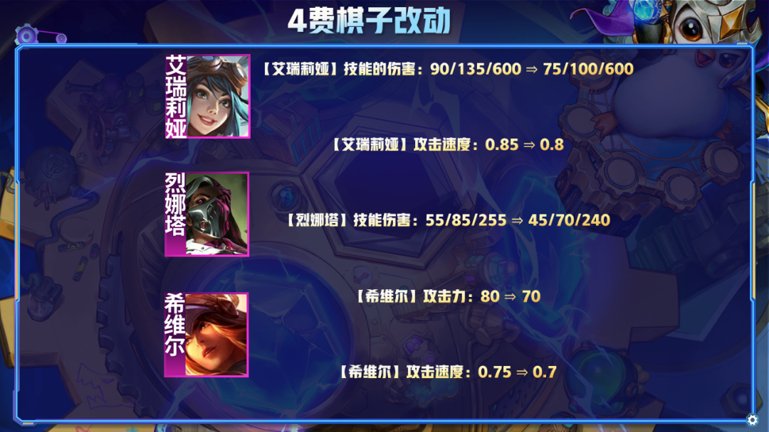 解析:刀妹主要是削弱了2星的技能伤害,在刀妹必备水银的情况下,2星刀妹如果没有名流羁绊的伤害可能大幅度降低,而且如果带了轻语无尽那套的话很难打得动斗毒的斗士前排,个人觉得斗毒天下的时候刀妹最好的那套是巨杀饮血水银,巨杀清理斗士非常快,饮血后期可以不站名流格,水银防止控制!毕竟如果后期你还站在名流格子的话别人只需要对着你的名流格吹或者静止法衣就完事了!其次烈娜塔削弱了2星技能伤害,虽然搭配着6斗的削弱,但是烈娜塔依然是版本T1级别的阵容而且我个人觉得吧六斗烈娜塔最重要的还是神装蔚,这次虽然稍微砍了一刀,但是影响不是非常大还是可以玩的,只是以后不会成为无脑冲的那种阵容了,希维尔削弱了攻击力和攻速,这些削弱不是特别多,但是对于希维尔最重要的海克斯羁绊削弱了,这才是最致命的,电刀特效流希维尔已经不能玩了,后续希维尔需要搭配新的阵容思路或者继续轻语无尽那套。