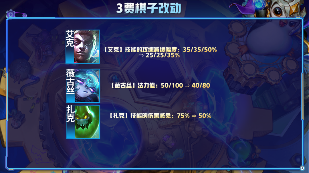 解析:艾克作为一个辅助类型的棋子攻速降低是一个非常正常的事情,这个可以理解,毕竟我玩的时候都是给他冰心法衣鬼书这类装备的!薇古丝是版本唯一加强的棋子,最大法力值削弱,意味着前排就足够肉,六约阵容或许可能成为主流!扎克这棋子在炼金跟六斗体系内说实话太能抗了,75%的减伤我玩个刀妹都捅不死他这波削的非常好!