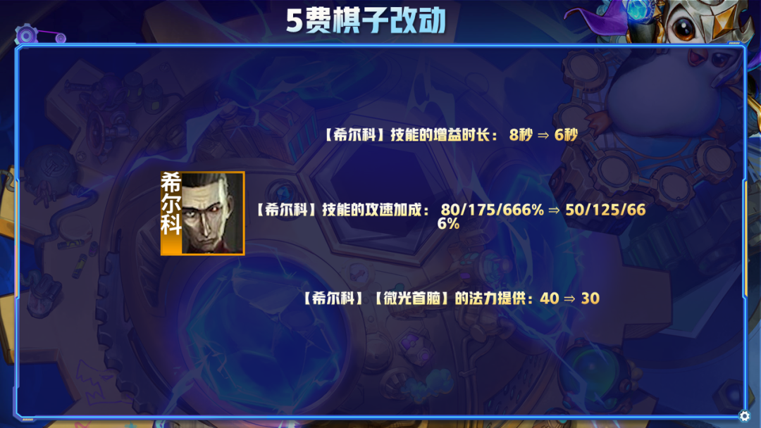 解析:希尔科作为5费卡的大哥,说实话是有点BT了,本次主要削弱了技能增益时间以及攻速加成,这就是削弱了前排坦克的控制能力以及后排输出的启动,并且希尔科提供法力值由40点削弱到30点,已经不再是关键的启动神器了,当前版本的希尔科会相对平衡很多,新版本或许可能成为内鬼?