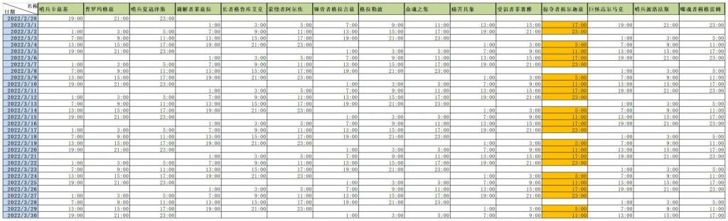 宏:/run local N,h,s;N={"哨兵卡兹","普罗","哨兵夏寇","调解","长者","萦绕","锤骨","格拉勒波","众魂之集","痛苦具象","受诅者","掠夺者","巨怪","哨兵派洛","噬魂者"};h=(time()-10820)/3600;s=math.floor(h%30/2)+1;for i=s-1,s+29 do print(date('%m月%d日%H:%M',(time()+(2-h%2+2*(i-s))*3600)),N[(i-1)%15+1]); end