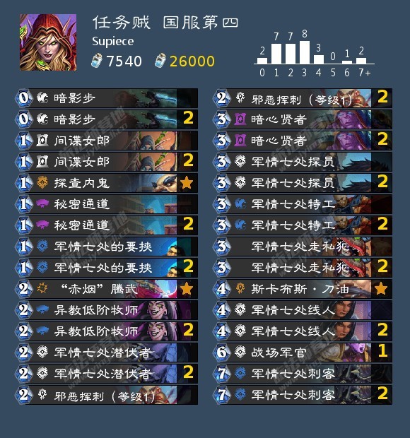任务贼终于“苦尽甘来”,成为了环境中最为主流的潜行者形态,新卡军情七处走私贩显著加强了任务贼的中期节奏,如果有较为正常的牌序,任务贼就是一套灵活到过分的中速节奏卡组,但如果倒霉起来,四费五费转刀空过这种场景也偶有发生- -。由于任务贼本身很难处理像c吵吵号角这种超展开场面,所以干脆放弃了8费的塑影匠师斯卡布斯,全力靠前中期的节奏型进攻来击溃卡杉德,异教低阶牧师也因此重回任务贼备选单卡。然而,目前环境下不怵潜行的间谍大师斯卡布斯的卡组也有不少,尤其是防守拉满的卡杉防战,任务贼基本赢不了——任务贼不仅需要一点手气,也需要一点走位能力。)另外,直至本文写完时,暴雪之前说要修复的军情七处走私贩的计数bug还没被修,如果在对局中第一次打出的军七牌就是军情七处走私贩,修复前她会召唤1费随从,修复后她会召唤0费随从。修复后会对任务贼的强度产生一定影响。