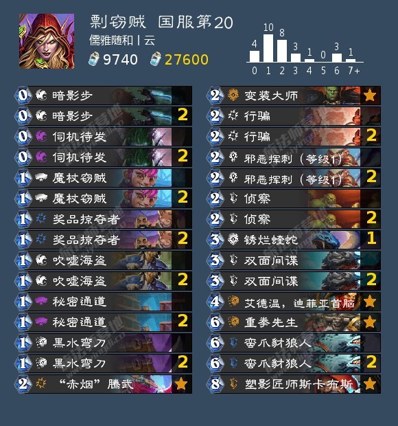 剽窃贼也有蠢蠢欲动之势,其构筑和打法基本没有什么变化,双面间谍也是抢卡杉德血量的一张好卡,后期艾德稳,迪菲亚首脑配合重拳先生的高血量斩杀也依然成立,除了蛮爪豺狼人不复以往,剽窃贼凭借其同时在线的娱乐性和强度也值得一玩。