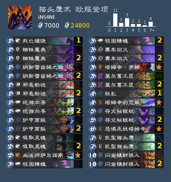 术士的出路,目前来看是“前朝之剑”猫头鹰术, 在不被软的前提下(毕竟卡杉德带不了软),符文秘银杖的加速能力依旧在线,天胡情况下,甚至可以四费跳币挂刀,五费过牌减费,六费送巨型猫头鹰,七费启动斩杀的“T7术”打法。绝大多数情况下,猫头鹰术的伤害都是超过对方血量的,玩家需要思考的地方就在于如何竞速或如何防守,如何及时送掉巨型猫头鹰,如何撑到启动的回合。闪金镇豺狼人的加入弥补了猫头鹰术的防守能力,在经过符文秘银杖减费后可以0费打出,润滑很多。