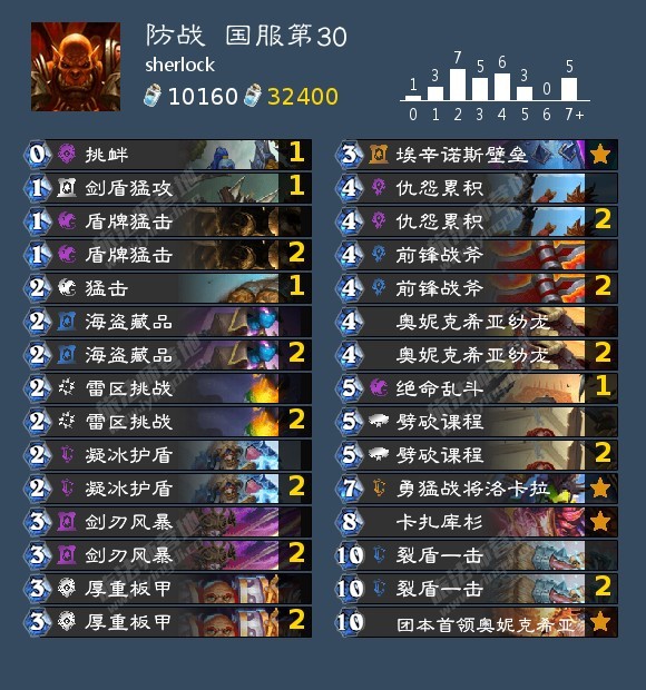 防战崛起就在今天!小光头是除了德鲁伊外最适合卡扎库杉的卡组,有了卡扎库杉的宝藏牌保底,防战可以放心地带满防守牌,面对OTK卡组时也能选择伤害型宝藏实现反杀。另外,新卡奥妮克希亚幼龙和团本首领奥妮克希亚完美契合了防战防守反击的思路,同时本身的龙属性不会影响卡扎库杉,甚至防战会携带挑衅配合团本首领奥妮克希亚当单向扭曲虚空用。防守牌的拉满使得防战对阵快攻卡组占尽了优势,在前锋战斧+劈砍课程的过牌体系下,卡杉防战甚至可以携带非龙随从,例如巴罗夫领主或吞噬者穆坦努斯去针对卡杉德。虽然在一些变态宝藏让防战对阵卡杉德仍然是劣势,但同时卡杉德使天梯中传统的按费拍怪型卡组几近消失,而这种持续给压力的卡组正是防战难以应付的,环境中抓卡杉德的快攻卡组增多,抓快攻的防战的环境其实是向好的。