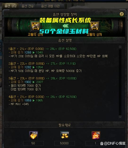 【1】属性成长系统。所谓的“喂养”经验值,来升级装备属性,但每次需要50个“金绿玉”材料。