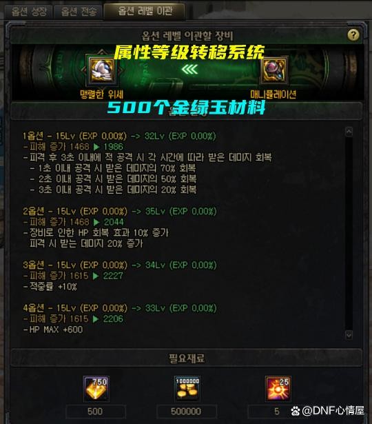 【3】属性等级转移系统。尽管装备属性不同,但属性等级依然可以平移覆盖,这个系统的材料,需要500个“金绿玉”。
