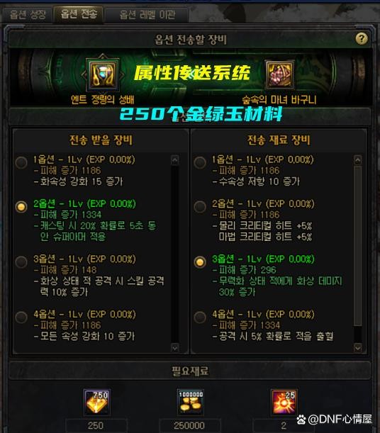 【2】属性传送系统。也很好的理解,类似于黑鸦装备遴选,把对应的属性转移传送,所需要的材料,得250个“金绿玉”才行。