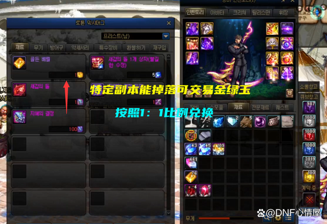 那么问题来了,“金绿玉”材料如何得到?通过刷副本的形式,玩家能够掉落,不过分可交易和账绑两种。我们刷正常副本时,能掉落不可交易的“金绿玉”材料,用于装备各种途径。但打特定的副本,就会掉落交易型“金绿玉”,在NPC诺顿处,按照1:1的比例,兑换成无法交易形式。