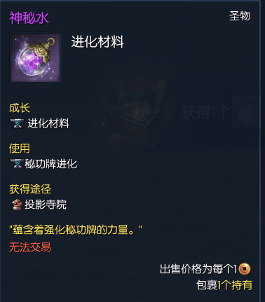 神功牌觉醒需要用到专属材料神秘水。神秘水可以通过投影寺院任务获得。