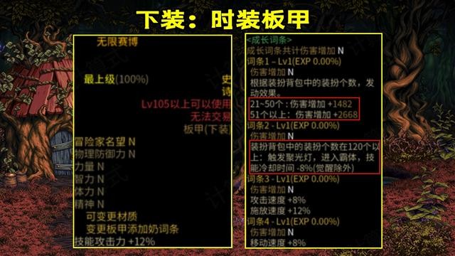 下装部位,推荐选择“时装”,基础词条技能攻击力+12%,成长词条1是“背包里有20件装扮的时候,伤害增加1482,有51件装扮的时候,伤害增加2668”;成长词条2是“背包里有121件装扮的时候,全程霸体,减少8%非觉醒技能CD”。