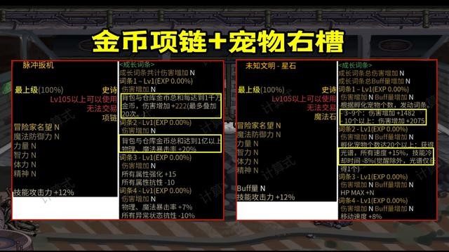 项链部位,推荐选择“金币”,基础属性是技能攻击力+12%,成长词条1是“背包和金库有1000W金币的时候,增加伤害222,三速对应减少1%,最大叠加20%”,也就是说,身上常备2亿金币,可发挥最大伤害4440,但是会减少20%三速。成长词条2是“1亿金币,增加20%双爆”,词条3则是增加15点全属强。