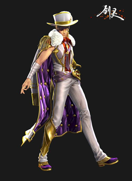 这是套带有明显英伦贵族风的时装,除却高顶礼帽之外,时装还加入了吊穗肩章、金属饰品,服装的主色调也多以纯白和高贵紫为主,让整件衣服极其时尚奢华又大气。