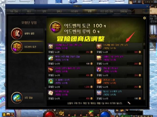 在105级版本中,冒险团等级提升50,商店也进行了调整,新增了105级史诗自选礼盒兑换。当你花费900个冒险硬币,就能从商店中,兑换1个105级史诗,降低了装备的获取难度。