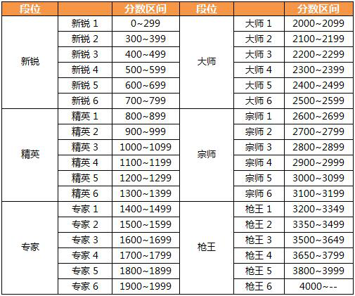 为了方便玩家理解,减少玩家的认知难度。本次更新除了枪王段位以外,其他段位的区间分数都已固定成100分。枪王段位之前升级更加容易了呢!