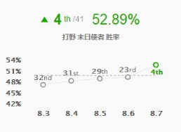末日在8.6版本中的胜率仅为49.57%,在英雄和核心装备都没有做出调整的情况下,电刑末日在8.7版本的胜率飙升到了52.89%,上升了3%以上,排名所有打野的第四位。