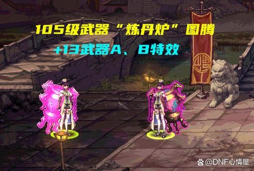 【2】+13特效外观。当赋予主武器+13后,“炼丹炉”的特效外观,逐渐的帅气起来。有“A类型”和“B类型”特效,供玩家来去选择,萝卜青菜各有所爱,但两者风格迥异。A类型不会覆盖105级幻化的武器外观,在表面上散发红彤彤光芒,B类型要更加夸张些。