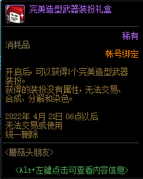 DNF完美造型武器装扮礼盒开启后,可以获得1个完美造型武器装扮。获得的装扮没有属性,无法交易、合成、分解和染色。主要是用来幻化的,这次的武器装扮外观比较特殊。