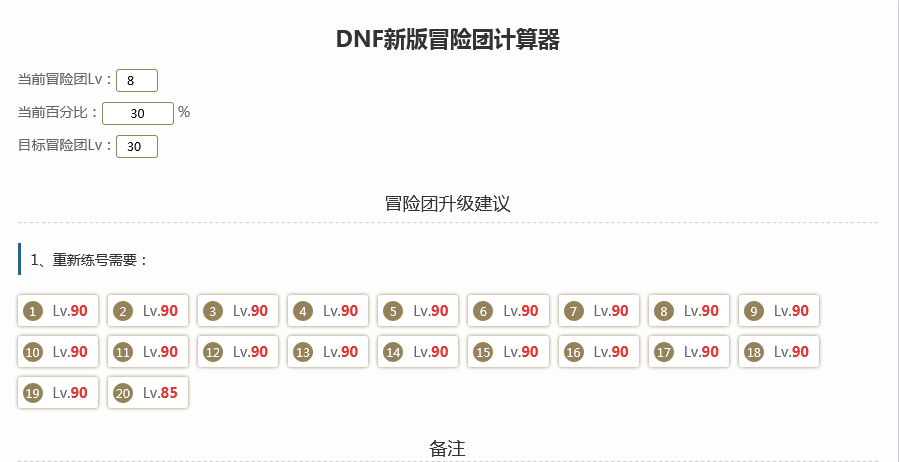 本次小编给大家带来DNF最新90级冒险团计算器网页版,在网页中填入自己各角色的等级可以查看到现有的佣兵团经验值,是一个非常实用的工具。下面小编就给大家带来最新90级冒险团计算器网页版!希望对大家有所帮助!