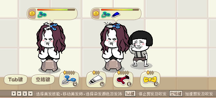 小游戏的规则很简单,方向键操控角色位置,按Q/W/E/R可以使用对应工具进行理发,使用工具后按空格键加速理发,按TAB键结束理发。