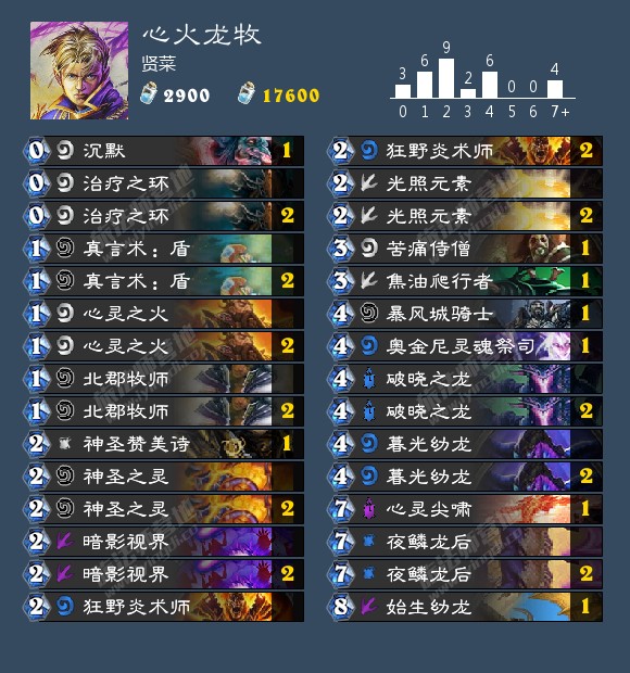 牧师在女巫森林的表现只能说可圈可点,没有赶上奇偶数这班神车便只能延续上版本的老套路自娱自乐,这套心火龙牧对阵奇数骑并不落下风,而面对城墙德等版本一线卡组的时候便没有了太大的优势,小编只能把这套牌推荐给牧师的死忠粉,下面就一起来了解下吧。