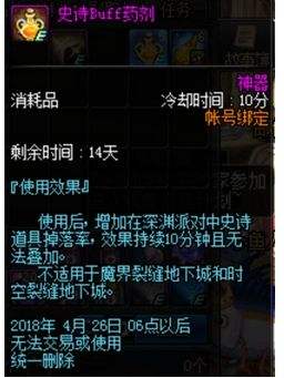 这次史诗buff药剂的适用范围仅限普通地下城的深渊模式,并不适用于魔界裂缝和时空裂缝,所以吃了药剂兴冲冲的跑去时空裂缝刷深渊的小伙伴可一定要看清楚了:药剂不适用于魔界裂缝和时空裂缝。