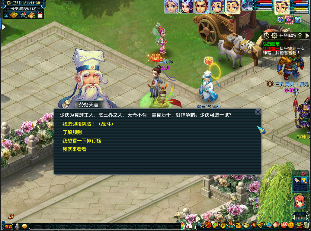因少侠的辛苦劳动,三界食肆声名远扬,引得其他各方饭店羡慕嫉妒,前来踢馆;三界之大,无奇不有,美食万千,厨神争霸,玩家可愿一试?劳动节活动期间全天,玩家(≥30级,≥3人组队)可在长安城(233,115)劳务天官处迎战踢馆,每层首通都会有丰厚奖励,并且每日都有5次日常奖励机会哦!任务可以获得劳动节积分。