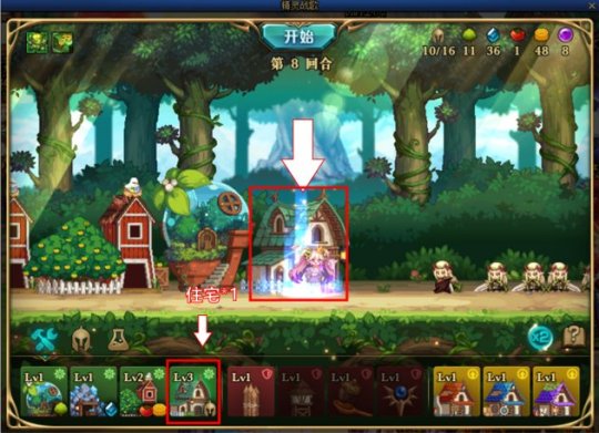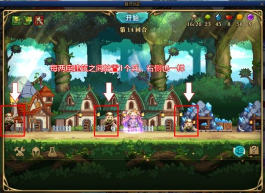 本回合建筑中间会出怪,调整兵力位置。差不多每两座之间站一个兵,最外边两侧各留4个即可结束回合。(当然怪把建筑拆了也不怕,补上就行,咱们资源管够。)