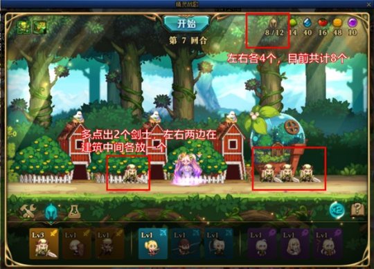 本回合建筑中间会出怪,点2个剑士出来(目前8个),每边建筑中间1个,最远处3个布置。