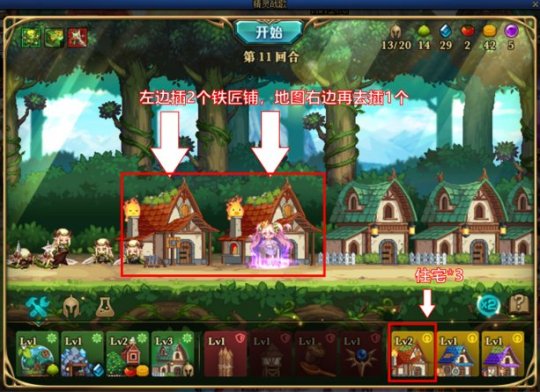 左边插2个铁匠铺,右边插1个铁匠铺,结束回合。