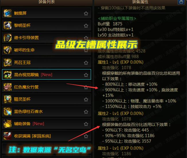 【1】属性1。根据穿戴的所有装备的品级百分比总和适用以下效果:①800%以上时,移动速度+10%;②900%以上时,攻击速度+10%,施放速度+15%;③1000%以上时,物理、魔法暴击率+10%;③1150%以上时,技能攻击力+5%。