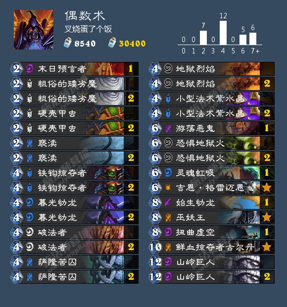 再就是把血量控制好,场面稳定住基本就很难输掉。包括能铺场的奇数骑在内,由于本套牌清场能力很强,报告兵很难站的住场面,用高攻怪踢脸,低攻怪解场,嘲讽怪护脸就可以苟得住。唯一比较难打的职业就是奇数快攻猎,护住场面基本没问题,只是很难挡住对手的每回合射箭。像面对战吼萨的话,基本都可以无视对手的场面,很多时候都可以全部走脸,解掉对手嘲讽怪以后全部打脸,对手的图腾和杂毛怪都可以不必理会。除了奇数猎以外,其他职业很好应对,只要记住护住场面高攻踢脸,对手基本抵挡不住。