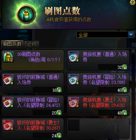 消耗疲劳值会获得刷图点数,使用刷图点数可以在面板兑换不同难度的高级地下城门票,是高级地下城门票的主要来源之一。