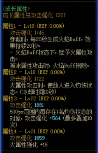 (1)可以成长的属性,字体为黄色,会随着属性等级增加而提升。一般为攻击强化属性。