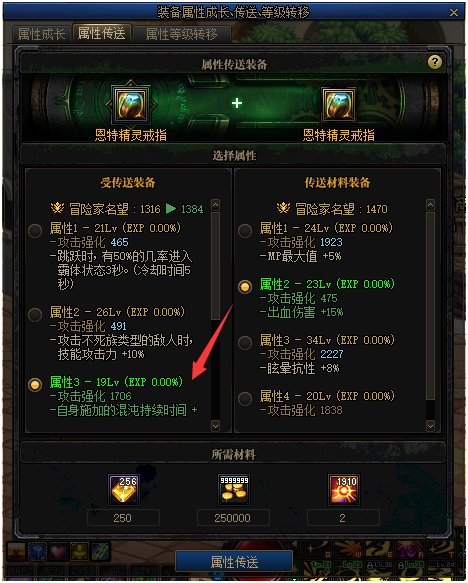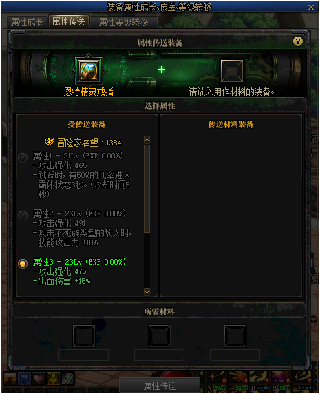 这种装备可选择一个属性,转移到另一件拥有成长、传送属性的装备上。但传送之后,除了选择的属性,其他属性词条都会被锁定,无法转移。而作为材料的装备则会消失。