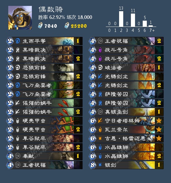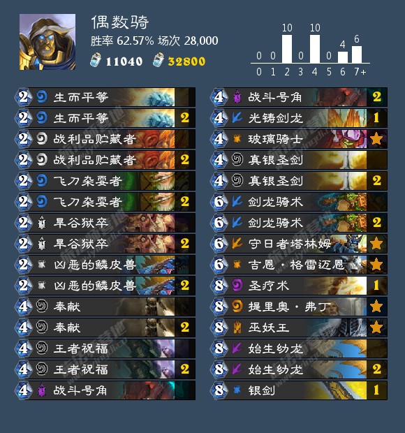 无独有偶骑有2个版本,一个是早期的2突袭版本,为了克制快攻奇数骑做到号角下去就返场,高费曲线带的是剑龙骑术、巫妖王、佛丁、2个848等,偏向于防守。