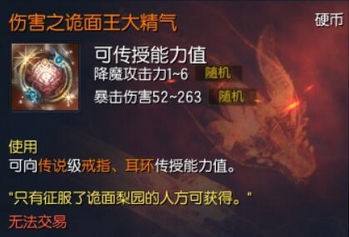 2、一件装备可以有最多2种传授属性,比如上面图里有的,降魔攻击力,暴击,暴击伤害这3种里面选2种,(韩服的话还有生命值)。一个未进行传授的首饰,用伤害之诡面王大精气去传授,会出现降魔攻击力1-6,以及暴击伤害52-263这两种传授属性,但是如果你换一个降魔之诡面王大精气去继续传授,原先的暴击伤害会被洗掉,变成降魔攻击力和暴击的组合。同时如果你封印已经传授过的首饰,传授值会消失掉。因此这里降魔攻击力,暴击,暴击伤害三选二怎么最大化收益,也是课题之一;关于这部分笔者应该会在国服传授上限值确定后分析。
