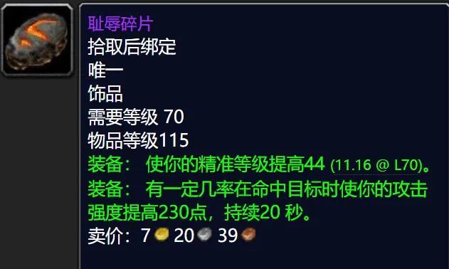 耻辱碎片每日一刷,精准属性练级很重要一定要入手。另一件饰品随缘即可,不花钱的有嗜血胸针和刃拳的宽容,到诺森德很快就可以换。