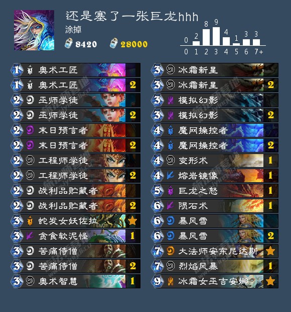 一开始构筑这套套牌的时候,我是想针对那些抓快攻的控制卡组,例如魔块术和墙德还有控制法,当然没有解牌较容易被我控场的恶毒卡组也在我的打击范围之内。然后在不断地修改途中,我加入了一些对阵快攻的卡牌,然后在基本修改完成的时候,我发现这套针对慢速的牌在打天梯最热门的快攻——骑士也并非很大劣势,最终版本的成绩是:对战天梯最多的骑士38场,胜利25场。