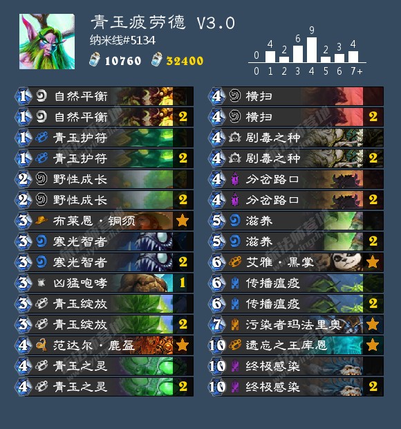 本卡组放弃了优秀的青玉单卡——青玉巨兽,选择了满编青玉之灵以及外挂铜须。说说我的考虑吧,青玉巨兽的作用有二点,一是青玉加一,二是作为一张优质嘲讽阻挡1A类卡组铺场快攻的进攻步伐。然而,由于现在天梯两极分化严重,快攻普遍提速,一张6费才能下场的墙并不见得比4费就能参与场面交换的青玉之灵要实用,而且6费我们有传播赖皮这样更加优秀的防御单卡。更低的费用代表了更灵活的选择,同时更容易与本卡组外挂的铜须打出强力combo。