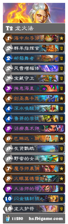 在雷纳索尔王子上线之后,由于环境整体降速,龙火法的热度和出场率也逐步攀升,在前几天的巡回赛淘汰赛的16人中就有11人携带龙火法,可见其强度之高。目前主流的构筑分为两类,一种携带前沿哨所和潜水俯冲鹈鹕,能够润滑前期节奏,4-1的突袭也方便对应豺狼人等前期生物。另一种是habugabu,gaby等选手青睐的,带群羊指挥官和闪金镇豺狼人的构筑。这里我们推荐后者,一方面是可以靠突袭随从处理场面,另一方面还能在变身之后修血,方便叠加火冲的伤害。至于40血龙火法,虽然增加了卡组厚度,但降低了摸到野蛮的女巫和巴琳达的概率,所以实战效果并不是很理想。龙火法的主要获胜手段是通过巴琳达或者野蛮的女巫减少龙火护符或者大法师符文的费用,再配合灰贤鹦鹉完成场面超展开,对阵慢速卡组也能依靠晨拥变身之后的高额技能伤害完成斩杀。有时候对手为了防法师的野蛮的女巫,会强行卸掉低费法术,也有打乱对手节奏的效果。在当前的环境中,很难有卡组能在4-6回合打完手中所有的法术。在对抗野猪牧时,如果野蛮的女巫直接换到不朽护符的费用,就几乎宣告了游戏的胜利。留牌方面主要找key牌:邮箱舞者,野蛮的女巫,深水唤醒师,巴琳达。(内战巴琳达的优先级最高)只要在4-5回合能够成功靠野蛮的女巫或者巴琳达打出大法术,几乎没有劣势的对局。