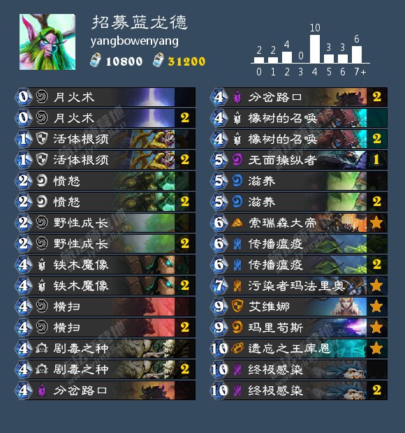 两张橡树的召唤加两张橡树是四张牌。如果加上鹿盔(塔斯钉狗!呵呵是啊!)就是五张。在天梯一半对局里,这四张牌都没用。而在另一半对局里,它们也无法起到一锤定音的决胜负效果。这四张牌位要不全扔,要不全留,没有一二和三。最糟糕的是,无论你放了多少被招募的对象、橡树的召唤空发的概率以及橡树射手的概率永远是最高的。极差的游戏体验迫使大量蓝龙德玩家起手留橡树的召唤........那么问题来了,谁给你的勇气起手留这么慢又不能决胜负的牌?梁静茹么?