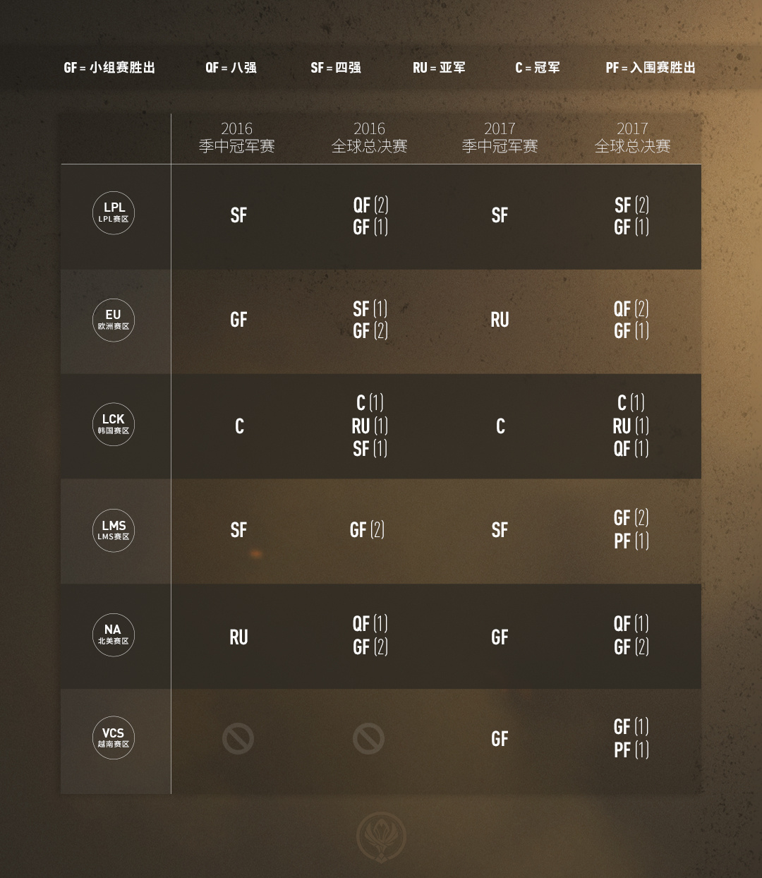 全球总决赛是一年中最为重要的赛事,同时也囊括了最多的参赛队伍,因此在决定分组的时候,全球总决赛上取得的成绩将会优于季中冠军赛上取得的成绩加以考量。近期取得的成绩能够更好地反应目前的实力,从而也会优先于以前的成绩加以考量。我们会通过晋级表现,而不是队伍的对手强弱或是比赛成绩来评判赛事结果。在这里,您可以看到过去两年的成绩汇总: