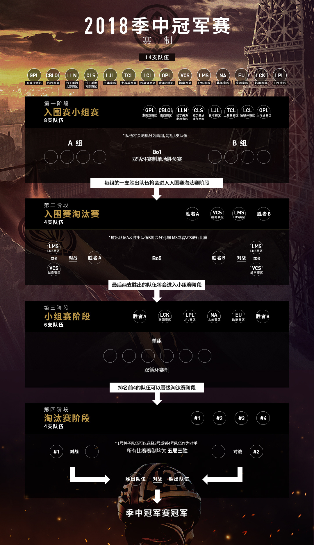 现在,2018季中冠军赛将会由代表全部14个英雄联盟职业联赛赛区的队伍出战。