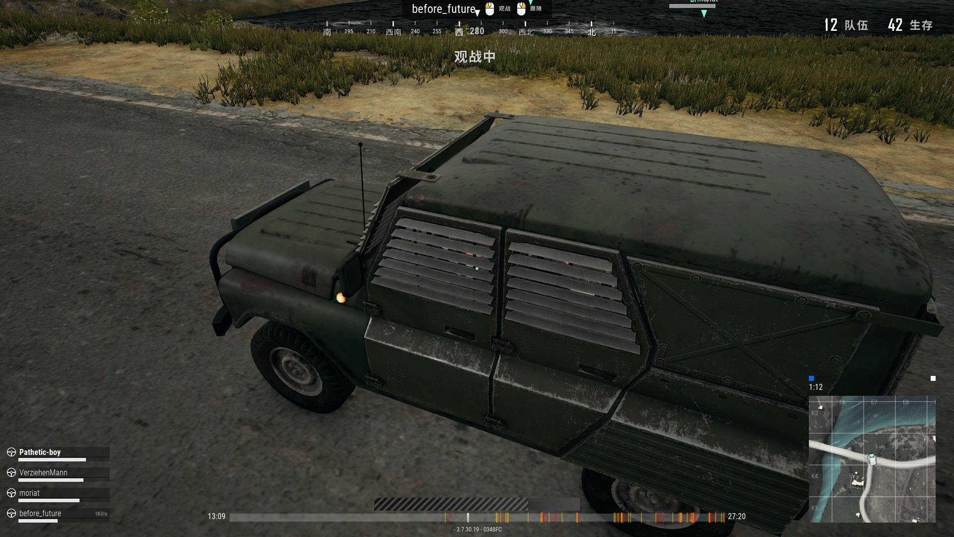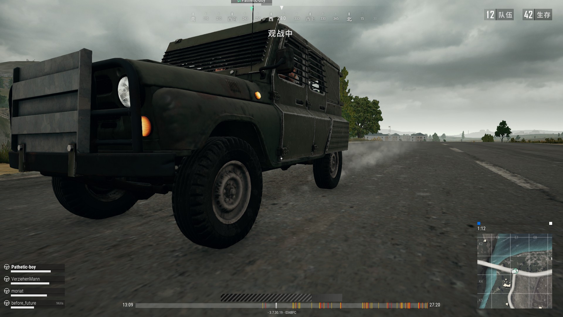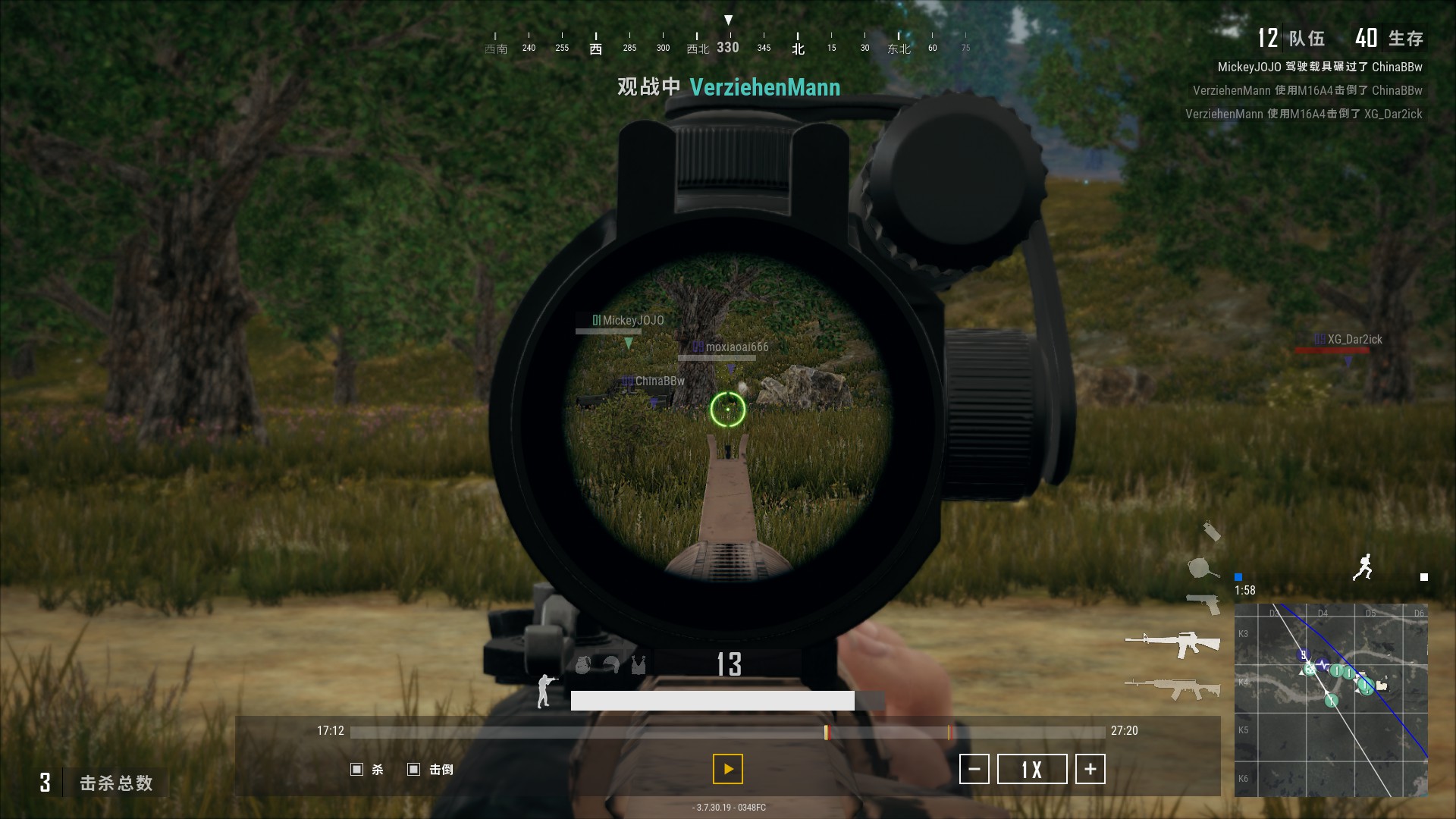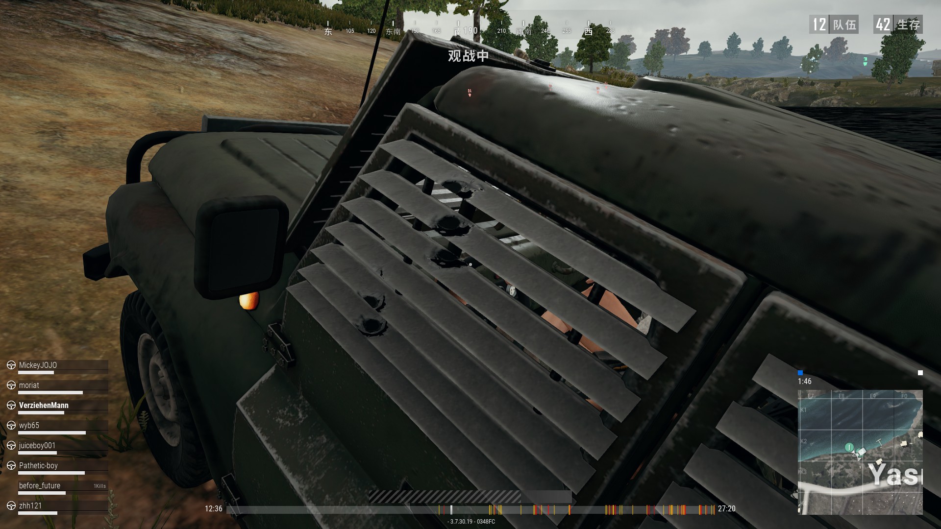 对手四名残敌占据面前树林有利地形,枪线角度广,一时压得我们抬不起头,米奇哥哥见状直接驱车上前,打算碾死对手,对手四人慌忙将火力集中于“堡垒”上,队友四人以人数优势凶猛地吞掉了近点的一个敌人,二小姐立刻转移位置并操起一手吃鸡民间广为流传的“二倍M16A4”,中二病突发,自由麦大喊:“是时候表演真正的技术啦!”迅速点掉对手三人。被集火时驾驶员只中了一枪,看图中血条,可见车辆的防护性能相当优秀。