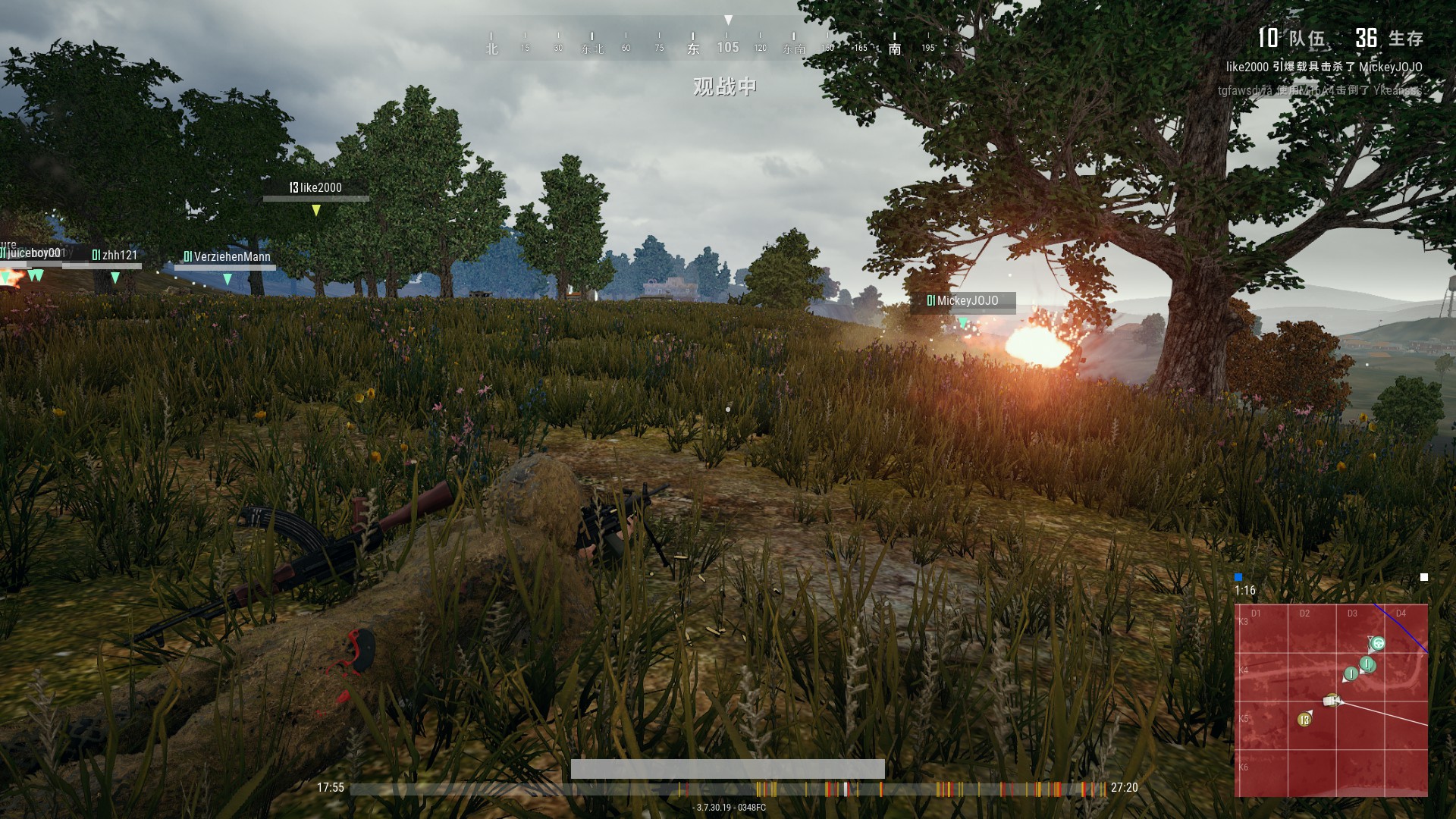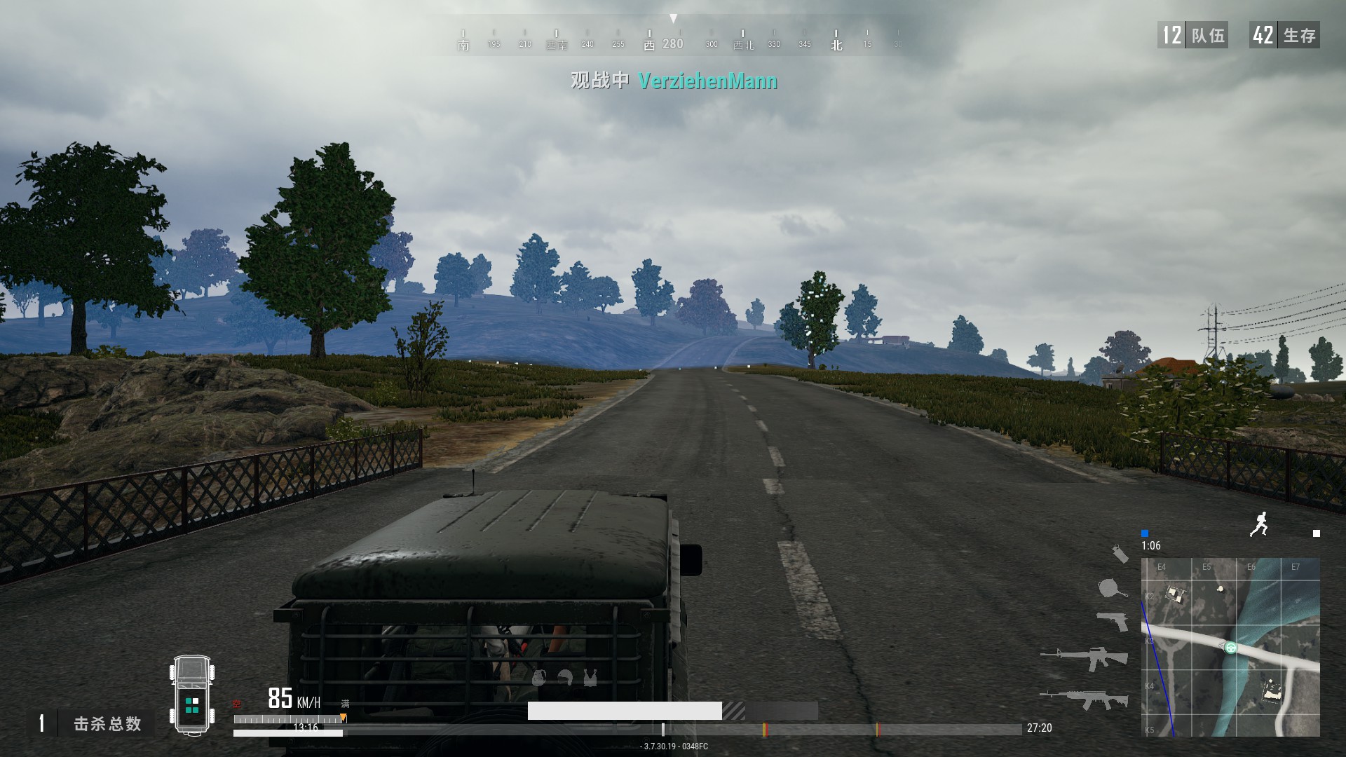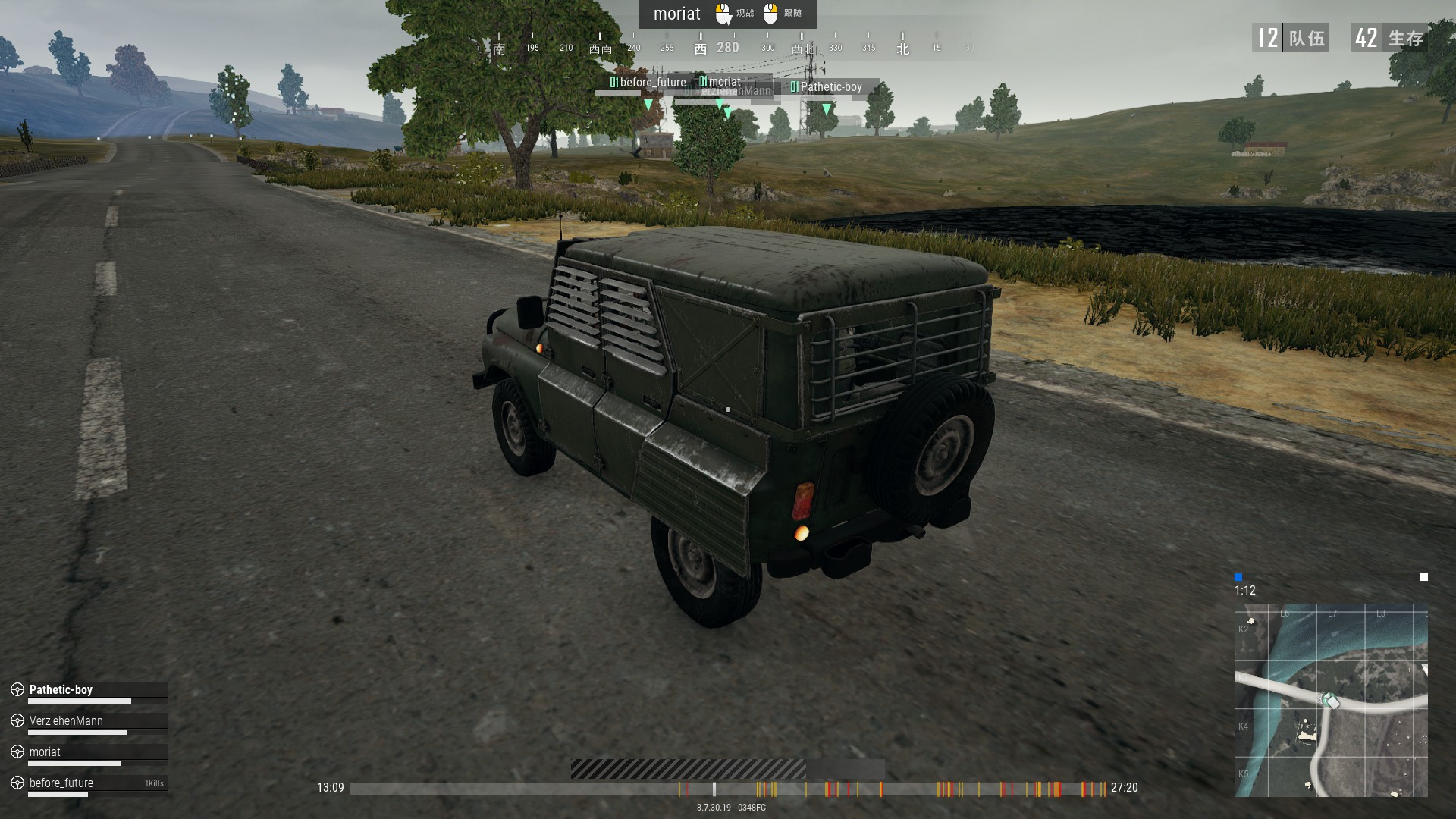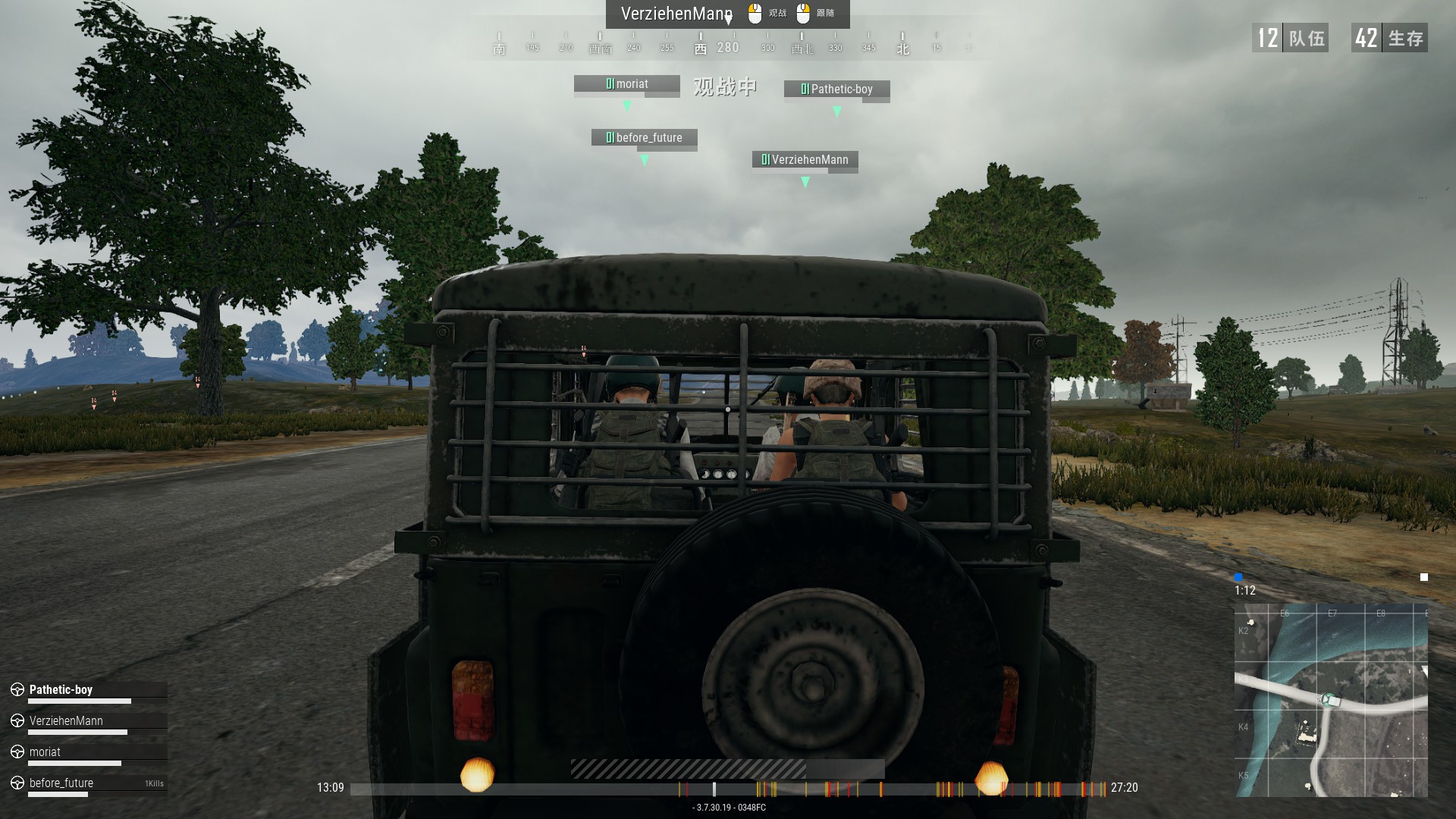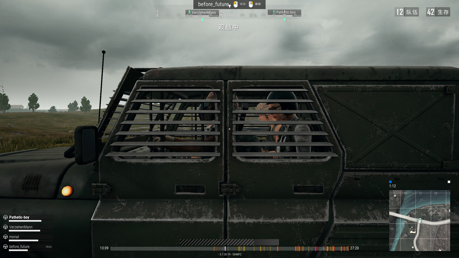 对手四名残敌占据面前树林有利地形,枪线角度广,一时压得我们抬不起头,米奇哥哥见状直接驱车上前,打算碾死对手,对手四人慌忙将火力集中于“堡垒”上,队友四人以人数优势凶猛地吞掉了近点的一个敌人,二小姐立刻转移位置并操起一手吃鸡民间广为流传的“二倍M16A4”,中二病突发,自由麦大喊:“是时候表演真正的技术啦!”迅速点掉对手三人。被集火时驾驶员只中了一枪,看图中血条,可见车辆的防护性能相当优秀。