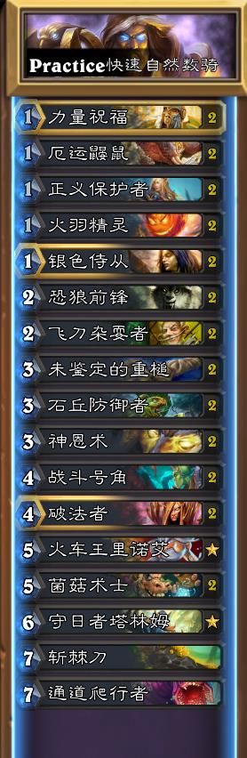 先谈卡组,这套卡组已经有一些水友分享过了,之前我也是有参考过他们的卡组和帖子的。 只不过大家的版本都不同,思路也有点不同,比如说 有的人带上了王者祝福和大宝剑,去掉了7费刀和通道。有的人则去掉了火车王,带了两个通道。 王者祝福和大宝剑有点偏慢 这里对于快攻骑来说 并不推荐,我在中速骑里面则带了这两张卡,下文会说到中速骑,这里不多做讨论。 主要谈一下火车王的问题,可能有些人会觉得没必要带,其实很不然,这是一张快攻骑极为而且又至关重要的一张卡。无论是解场还是斩杀,都有奇效, 对的,实际对战中 我用火车王来解场的对局还真不少,就是那种不解就崩了的怪。 当然 ,斩杀就不用说了,骑士手里摸不到7费刀和神恩的时候多了去了,相反捏一个火车王在手里则会安心的多,不要担心卡手问题,4攻刀7费之前不也是卡手嘛,而且通道打内战带一张足够了,而且节奏有些偏慢,所以不带两张。 然后是1费法术 力量祝福,个人点评:骑士前期抢血解场神卡,两张满编,必不可少,无论是贴在神盾鼹鼠还是烈焰精灵直接走脸,然后躲在11圣盾嘲讽后面,对面会非常难受,用来解掉其他威胁随从也是相当顺手。