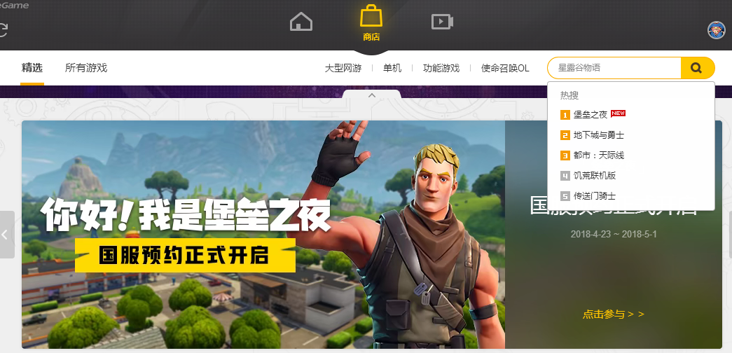 首先,大家需要找到游戏平台(Wegame,原TGP),然后在顶端点击“商店”一栏,在商店页面的搜索栏中输入“堡垒之夜”,点击确定随后将会跳转到下载网页。