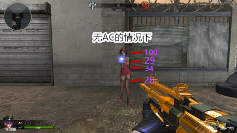 再来看看无AC的情况下伤害打头部100、打胸部29、打背部34、打腿部20,在无AC的情况下黄金Z型步枪的伤害就有所改善,在实战中打无AC的敌人就会变的超级轻松了,加上黄金Z型步枪的射速也很快枪开火的声音个人也比较喜欢,如果有这把枪的玩家可以在实战中试试千万别浪费了,说实在的跟其他掉落武器比较这个已经算是超级极品PVE掉落武器了,自身枪法很强的人用来打PVP真的是超神的存在了。