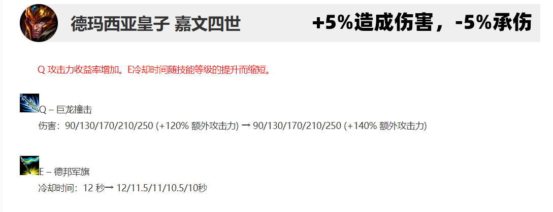 改动解析:上版本的被动加强似乎没有达到设计师的预期效果,这次又对皇子的核心技能EQ进行增强,Q技能增加20%额外攻击力收益,E技能满级减少2秒CD,技能急速起来后现在E技能后期CD只有5秒左右,加强幅度非常可观。
